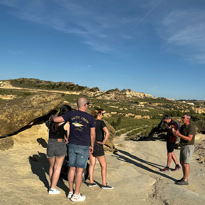 Comenzamos en Arguedas, donde te recibimos y te llevamos en una furgoneta Mercedes hasta el corazón de las Bardenas.