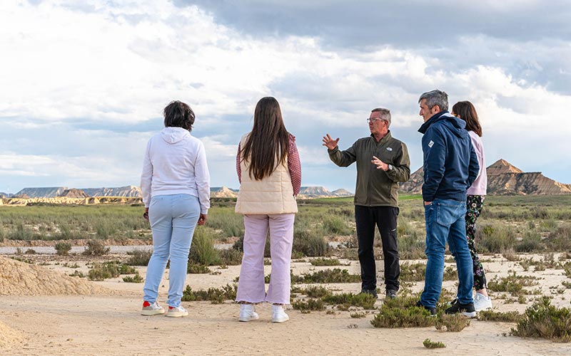 El guía se une al grupo en la entrada de las Bardenas Reales. La excursión es conducida por el guía que dirige la actividad. Al mismo tiempo interpreta para el grupo las bardenas reales.